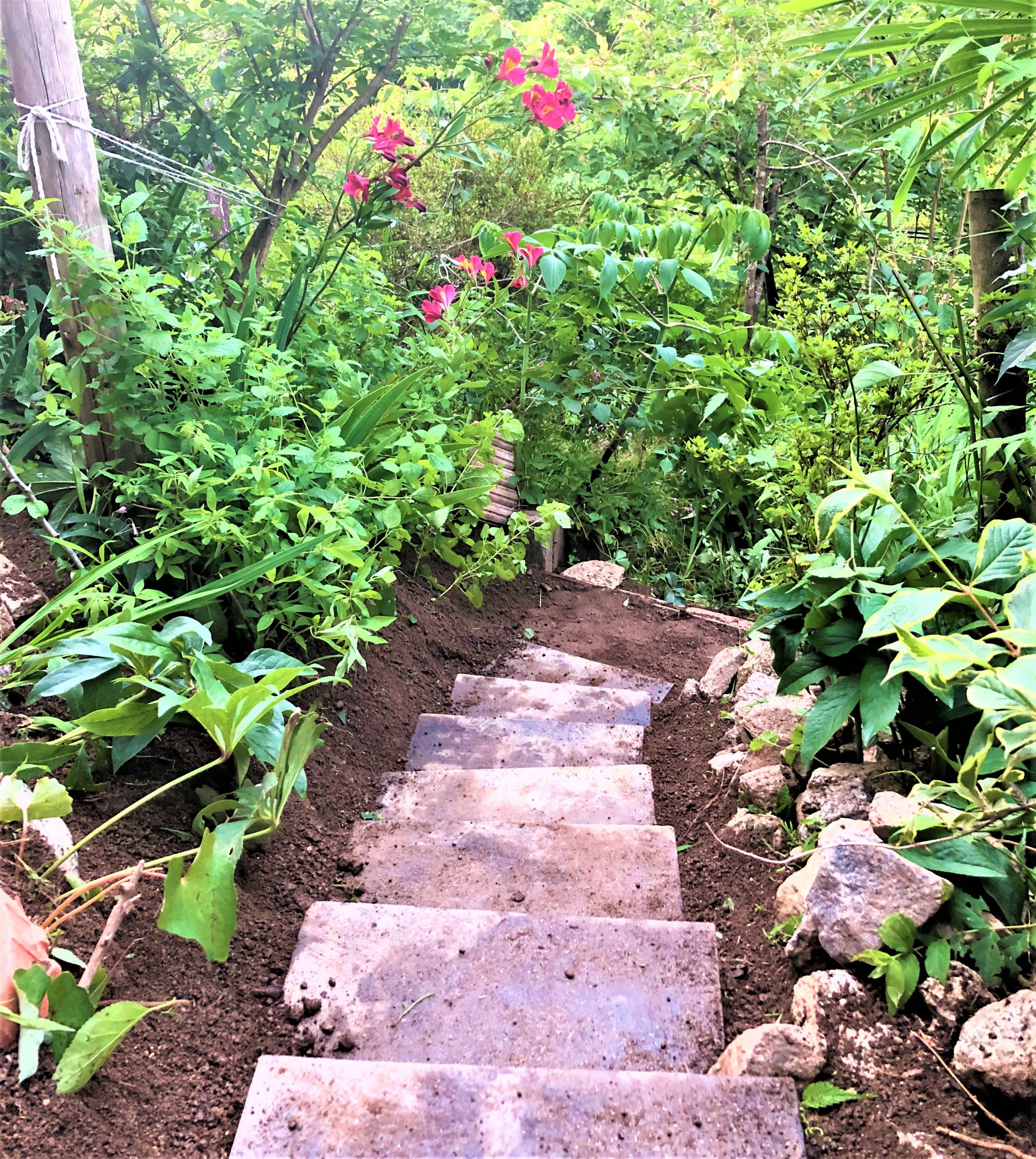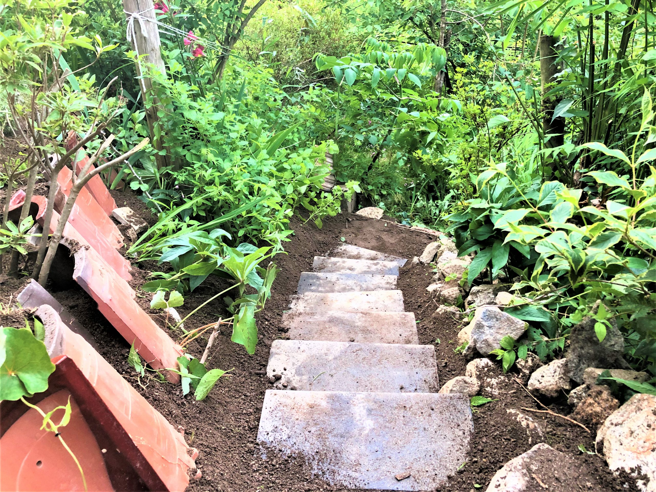 とても暑い中で 完全防備での階段作りに励みました。 虫刺されは常の事ですが 今日は最後まで刺されることもなく 終えたのに 最後に顔を覆っている 網を取って水を飲むときに 顔を蚊に刺されました。 蚊はチャンスを狙っていたみたいに。