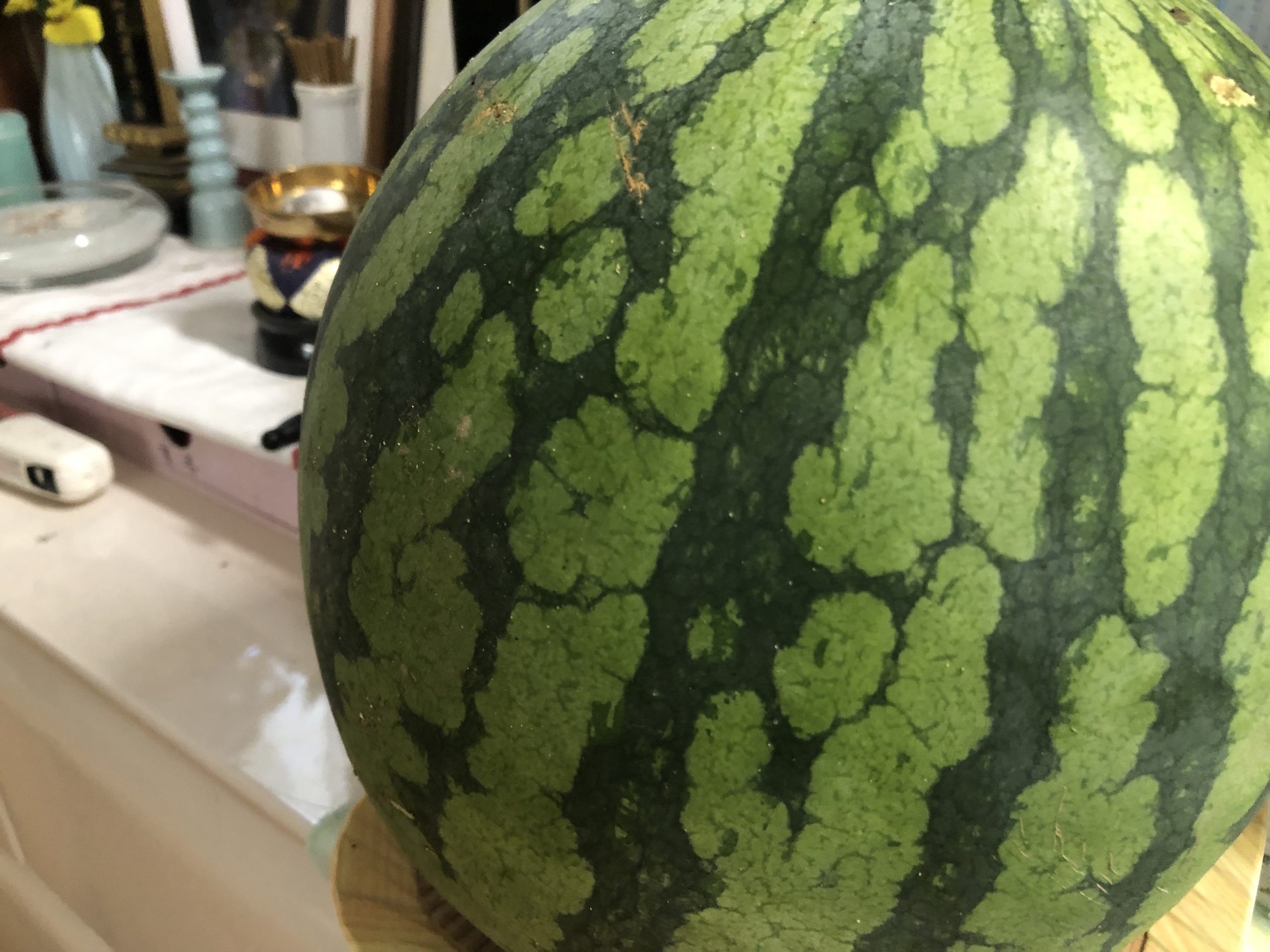 とれたてのスイカを「備えてやあ、気張らんとあかんで」とA様も。