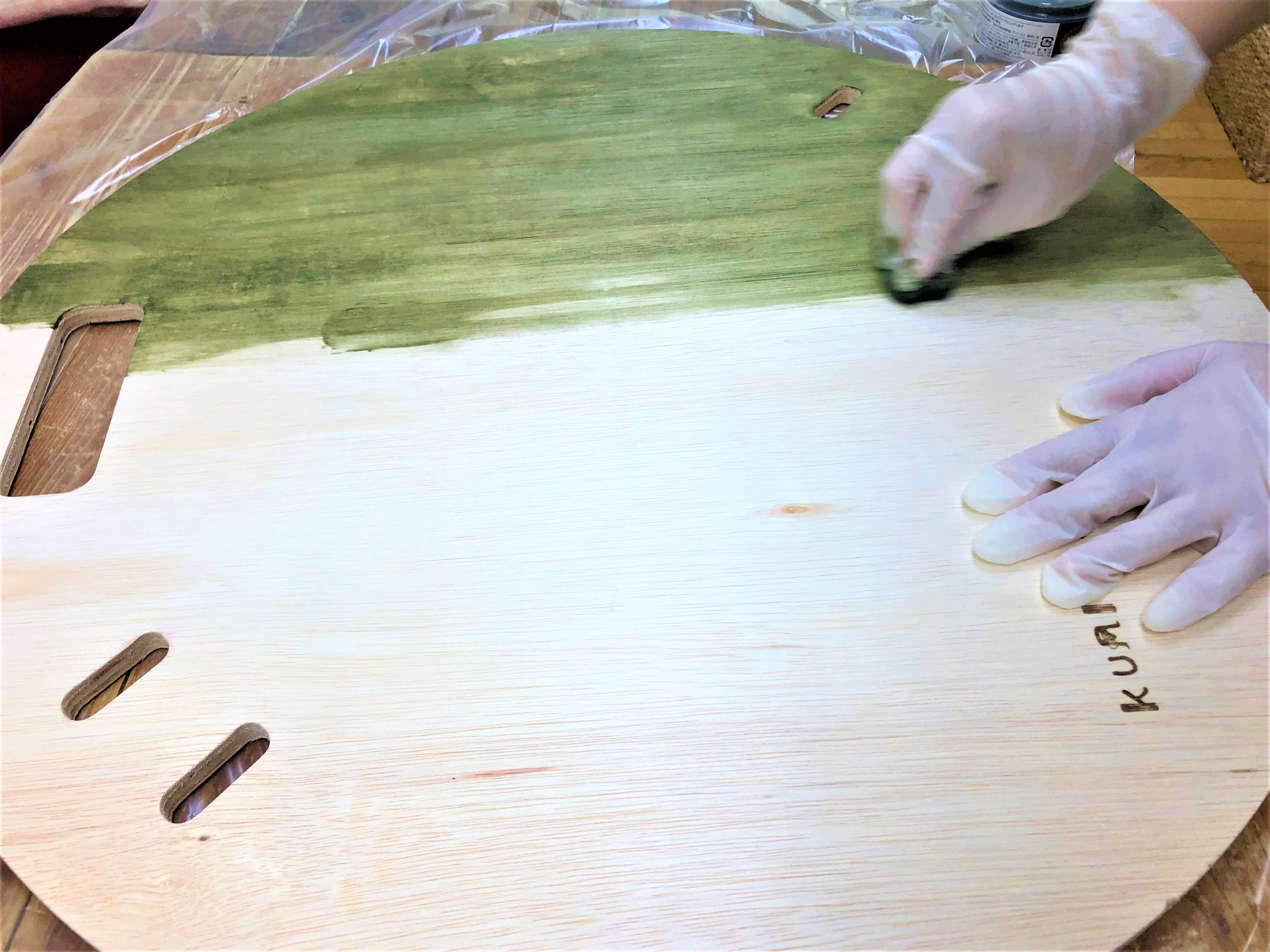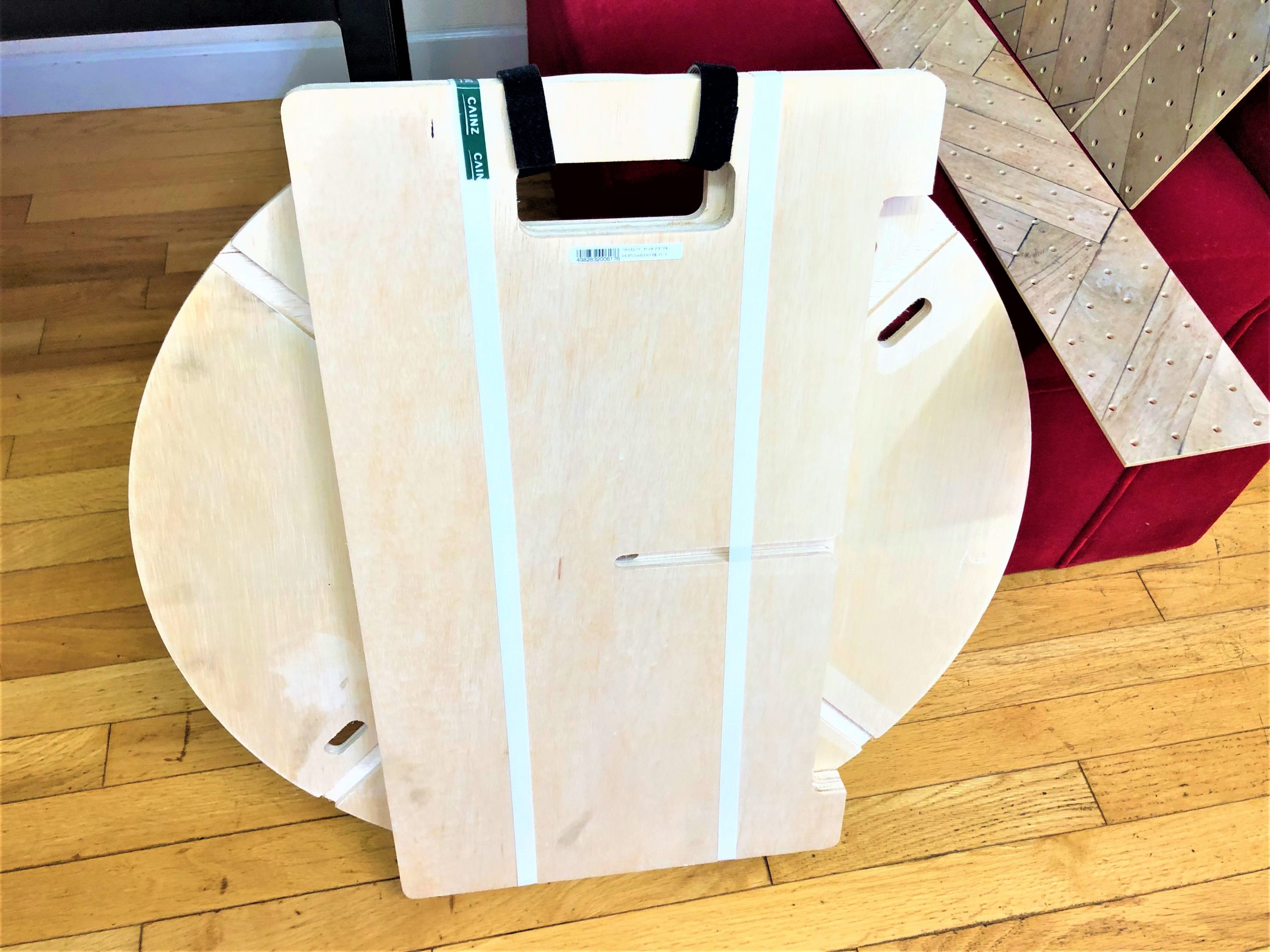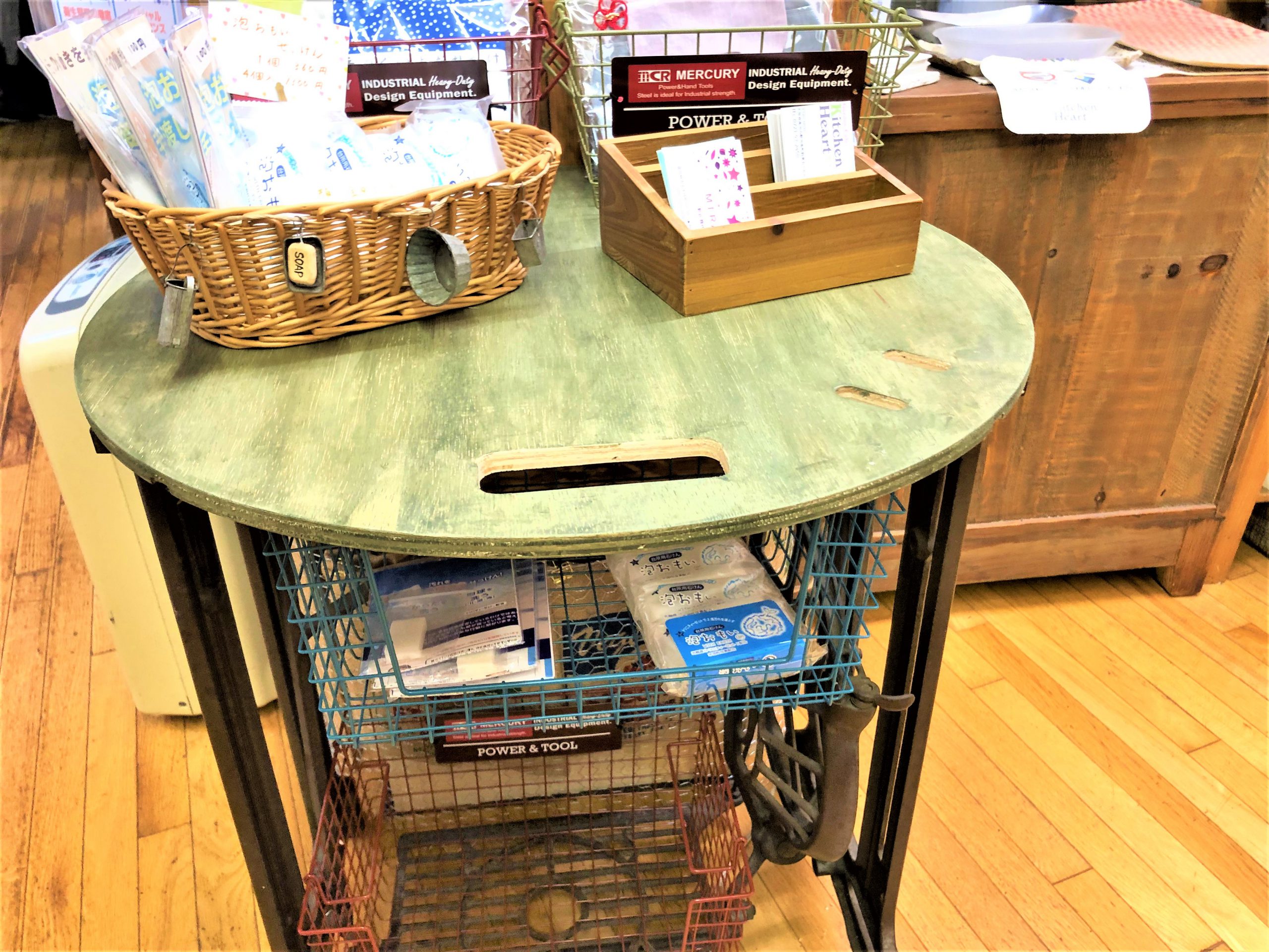 ミシン台に丸板を載せて