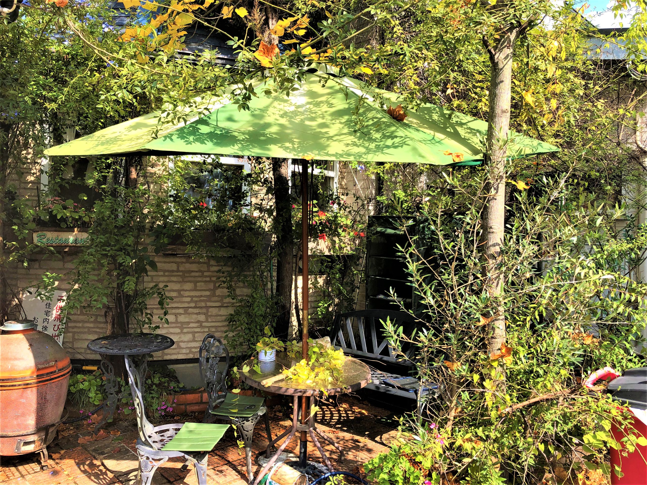 外のテラス席ですが地元の常連様がご自分でご用意されたお席です。土仕事が多いので店内へ靴を脱ぐのが大変ということでこの場所に席を設けて欲しいとのご希望があって快諾したところすべてご自身でご用意されたお席です。