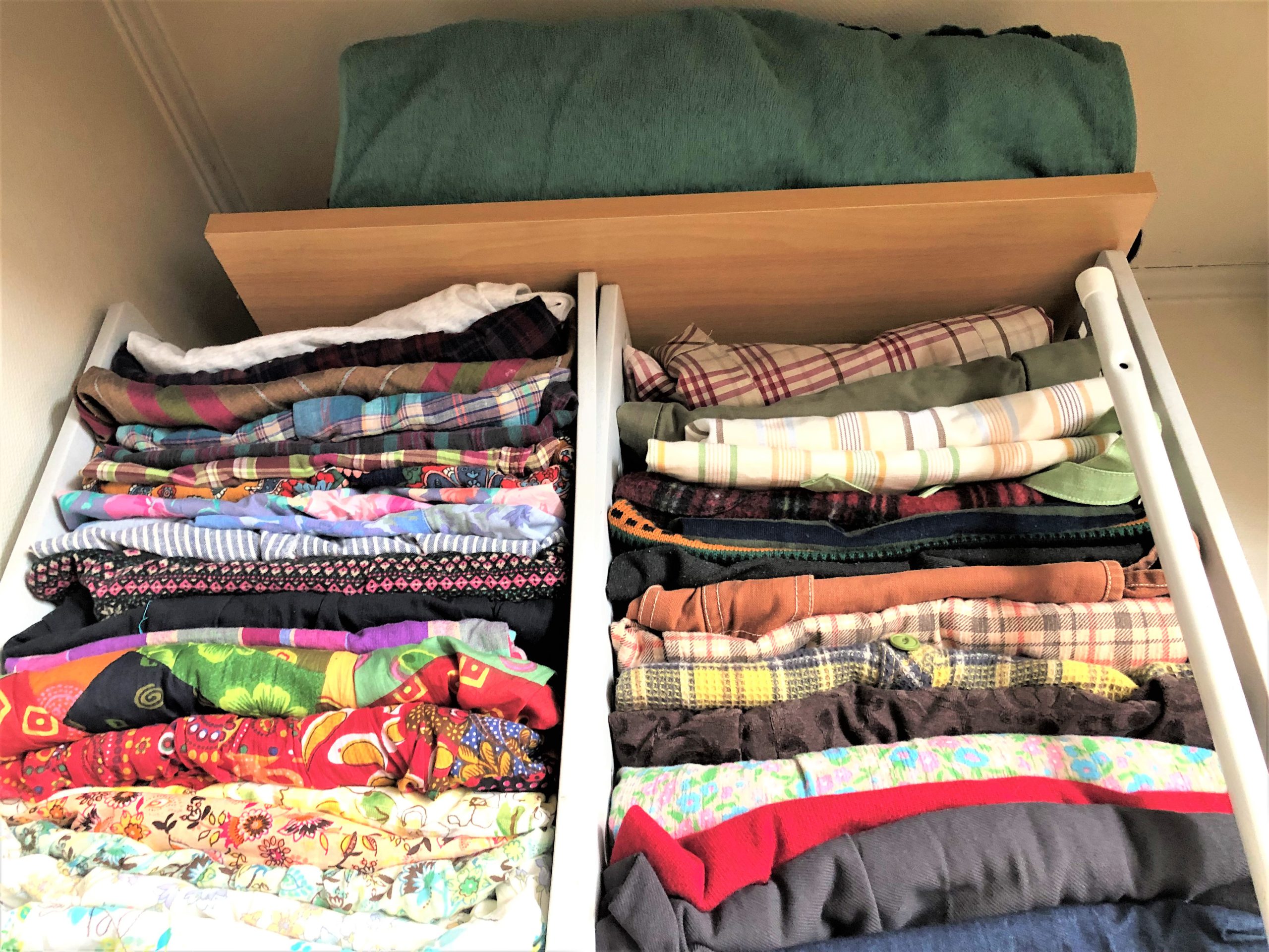 この一番上の手の届きにくい所は着古しの物ばかりでリフォームの予定の衣類です。その上のタオルで包んだものは思案中の衣類